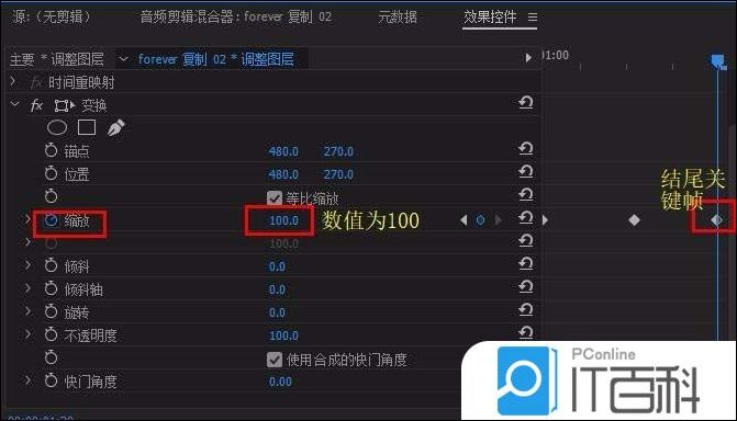 5、选中调整图层,在其“ 效果控件 ”面板中找到“变换”。将时间标尺移到调整图层开始处,打开“ 变换”-“缩放 ”前的动画图标,建立开始 关键帧 ,数值不变