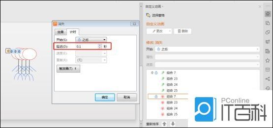 6、添加动画:出现、消失。将它们改为“从上一项之后开始”且一一对应,并把消失动画的延迟改为0.1秒,如下图所示。
