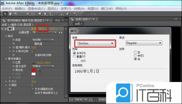 再选择这个字体就可以了,这个是宋体。在合成窗口也是正确的字体。