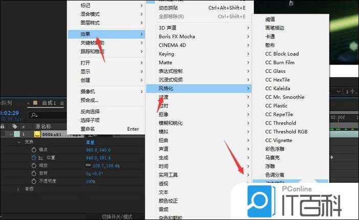 2、然后右击 视频图层 ,选择 效果--风格化--动态拼贴 。
