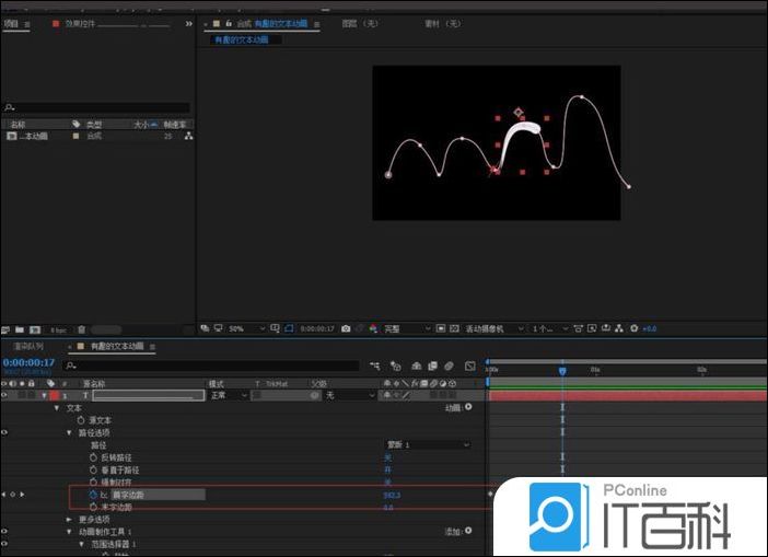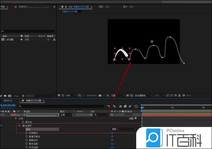 4、选中文本图层 选择钢笔工具绘制好路线,然后调整好的路径曲线,将文本的路径选成我们建立好的蒙版;通过调整首字边距k帧来实现动画;