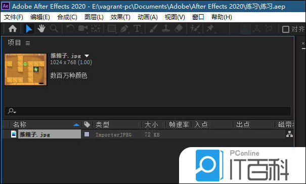 1、打开AE,新建一个AE项目,导入"小绿猪推箱子"游戏关卡3游戏截图。