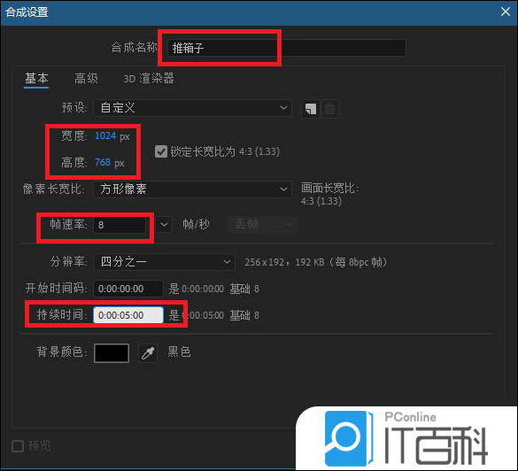 2、新建一个合成,命名为"推箱子",持续时间更改为5秒,宽高为1024x768,基础帧率为8。