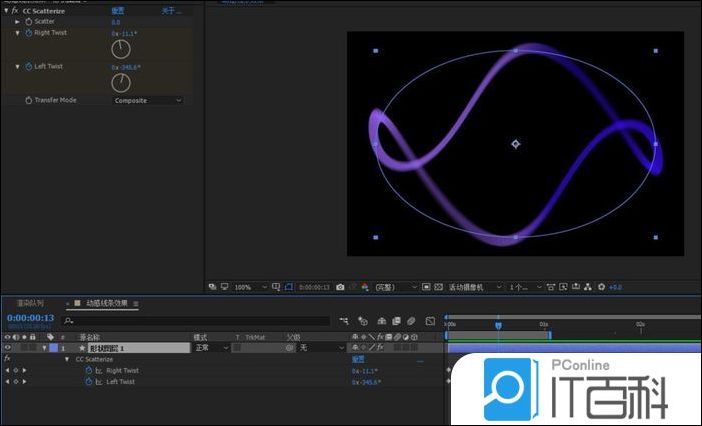 3、选中椭圆,添加 cc scatterize 效果 ,椭圆不需要成粒子效果,只需要做 扭曲效果 ,扭曲成你想要的的样子就行;