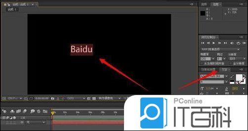 3、在“ 工具栏 ”找到“ 横排文字工具 ”(快捷键 ctrl+t ),单击选中,随后鼠标指针发生改变。在合成窗口选定文字创建位置,单击输入文字,在右侧的“ 文字 ”一栏可以对文字进行调整。