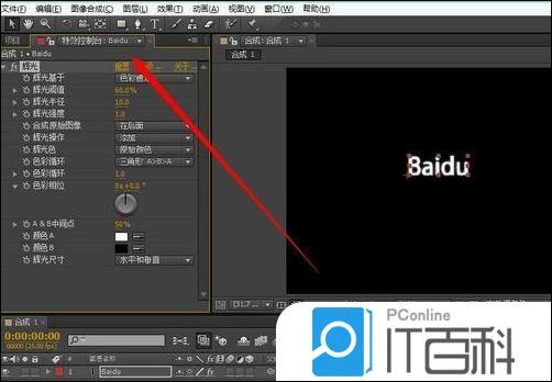 4、在“合成栏”右键单击,依次选择: 效果—风格化—辉光,选定后文字便产生了发光特效 。左侧弹出了“ 特效控制台 ”,在这里可以调整文字发光的阈值,颜色,模式等等...