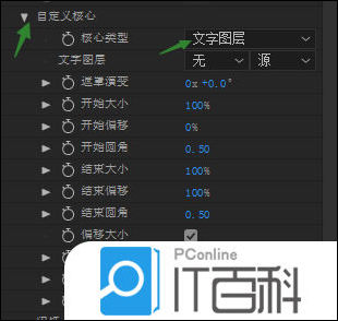 6、找到自定义核心, 勾选开始偏移 ,在0秒位置设为无, 也就是100%,之后设为0% ,使它完全出现。