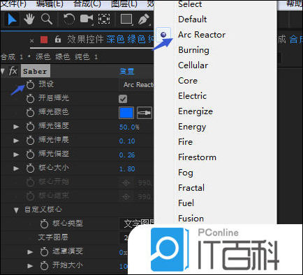 5、打开它的自定义核心,然后选择文字图层,文字图层选择你所设置的文字内容, 缩小它的辉光强度,改为10左右, 颜色可以按照自己喜欢的去设置。预设改为闪电。