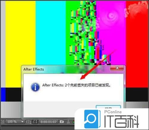5、当点击打开之后,它就会出现这样的显示:After Effects :2个先前丢失的项目已被发现。