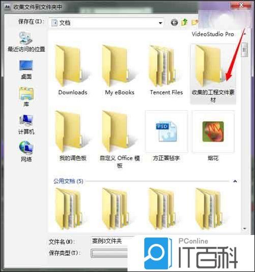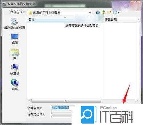 11、接着在弹出的对话框中我们可以选择一个位置,也可以新建一个文件夹把它命名一下,方便以后查看, 这里就把它的文件夹命名为收集的工程文件素材。