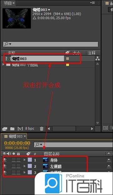 2、打开AE。然后,以合成的方式 导入分层的蝴蝶素材 ,并打开此合成。操作为 执行文件>导入>文件 ,或者直接使用快捷键 ctrl+i ,打开导入对话框,选择上一步制作好的蝴蝶素材,按如下图示操作:导入种类选择“ 合成 ”,图层选项选择“ 可编辑的图层样式 ”,然后点击确定。