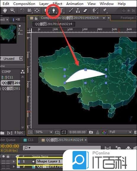 2、然后 不要选中底图 ,选中 钢笔工具 ,在视图窗口点击就可以新建一个形状图层 Shape Layer 1 ,然后我们绘制出来如图所示的一条曲线(和MASK绘制方法一样)。