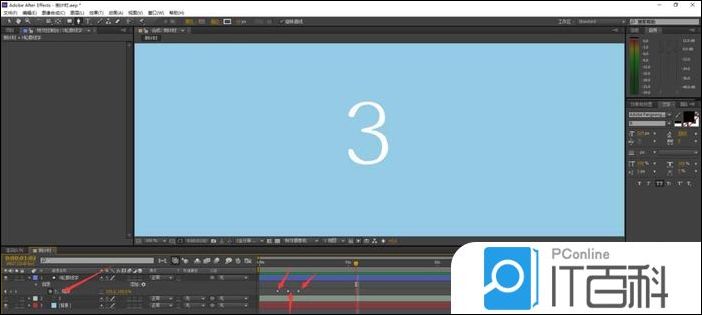 3、设定这个视频从3开始倒数,所以我们先用 文字工具 添加一个 “3”然 后在按住Y键来改变它的中心, 方便我们将它的大小调节至合适的位置。( 如图所示)