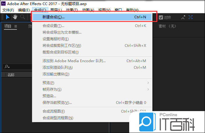 2、在AE项目中找到 合成菜单栏 ,点开合成菜单栏,在合成菜单栏中选择 新建合成 ,弹出合成属性设置窗口,在合成设置中设置合成的大小等,并将合成背景颜色改一下,不要默认的黑色。
