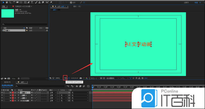 5、在合成1窗口下方打开“ 标题/动作安全 ”选项,分别单独选中 四个文字图层 ,用选 择工具 将这个四个文字分别都移开。