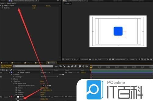 3、然后我们给形状层的位置加上表达式,我们先拾取控制层的位置,在位置后面加上 *再拾取滑块的位置 ,就可以了!