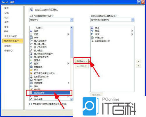 最后点确定,“合并后居中”这一按钮就添加到“快速访问工具栏”了。