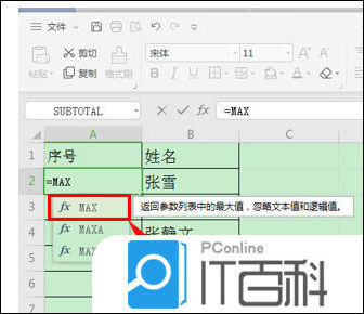 1、在序号里输入“=MAX”,然后选择MAX函数;
