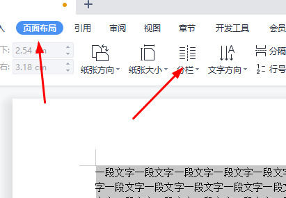 2、然后点击“ 页面布局 ”,接着选择“ 分栏 ”。