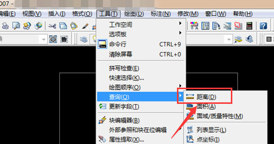 2、放大图纸之后我们点击CAD工具栏中的工具→查询→距离按键。