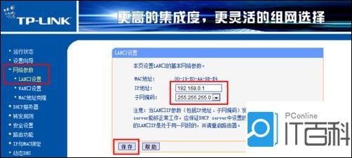 登陆主路由器管理界面,依次展开“网络参数”→“LAN设置”,将IP地址设置为“192.168.0.1”,子网掩码设置为“255.255.255.0”,最后点击“确定”按钮重启路由器。
