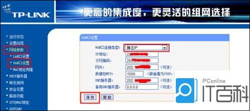 4、接着以“192.168.0.1”作为主路由器管理地址进行登陆。切换至“WAN接口”项,根据电信服务商所提供的连接类型来选择“WLan口连接类型”,本例以静态IP地址为例进行讲解。如果电信服务商提供的是静态IP地址登陆方式,则根据所提供的IP相关信息进行设置: