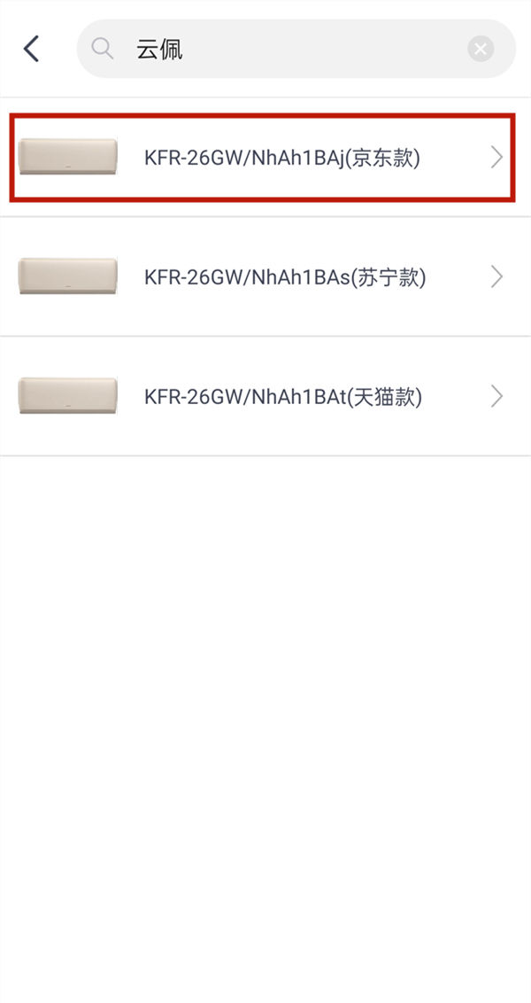 3、 搜索 框输入自己的格力空调名称后,选择对应空调类型。