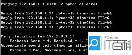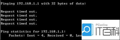 输入命令:Ping 192.168.1.1,回车。如果屏幕显示为: