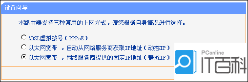 进入上网方式设置,我们可以看到有三种上网方式的选择,如果你家是拨号的话那么就用PPPoE。动态IP一般电脑直接插上网络就可以用的,上层有DHCP服务器的。静态IP一般是专线什么的,也可能是小区带宽等,上层没有DHCP服务器的,或想要固定IP的。因为我拨号所以选择pppoe。(PS:一般家庭用户都是选择PPPoE,也就是ADSL虚拟拨号上网)