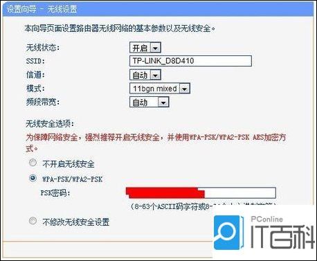 设置完成后,点击下一步,将看到 所示的基本无线网络参数设置页面。我们可以看到信道、模式、安全选项、SSID等等,一般SSID就是一个名字,你可以随便填,然后模式大多用11bgn.无线安全选项我们要选择wpa-psk/wpa2-psk,这样安全,免得轻意让人家破解而蹭网。(一定要记住你设置好的密码,密码丢失在安全设置里面修改,也可以选择重启路由器,重复上述操作)