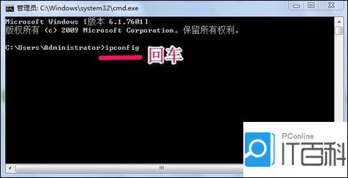 在命令提示符窗口中输入命令ipconfig,然后回车!