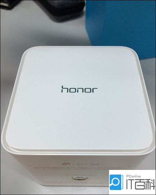 1、首先是正面的盒子大大的荣耀logo配合着天蓝色的的颜色,简约而优雅。整个盒子呈正方体,看起来一点也不失美感。