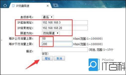 6、从弹出的新界面中,即可设置要限速的IP地址范围,同时设置“ 限速方向 ”以及“ 上行流量” 和“ 下行流量”, 点击“ 新增 ”按钮即可完成相关限速规则的添加操作。