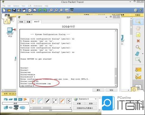 为各台路由器命名上相应的名字,命名路由器a的名字为a,路由器b的名字为b,路由器c的名字为c,路由器ISP的名字为isp,