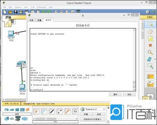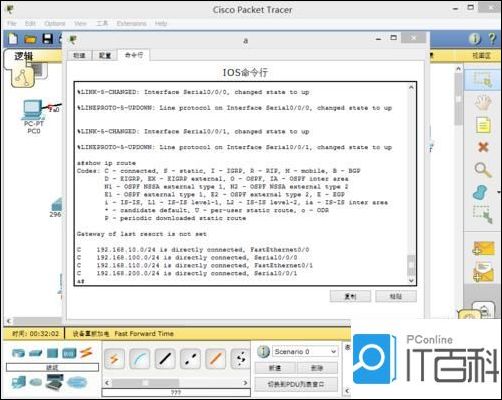 用“show IP route”命令在各台路由器上查看各台路由器的路由表,再用ping命令ping一下各台PC间的连通性,这时只有PC0与其他计算机不能通信,