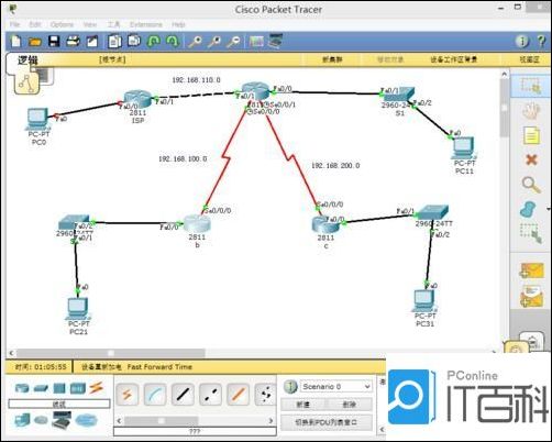 首先打开思科模拟器软件,找出Cisco 2811路由器4台,cisco 2960交换机3台,PC 4台,将它们按相应的顺序排列起来,并用相应的双绞线将它们连接起来,