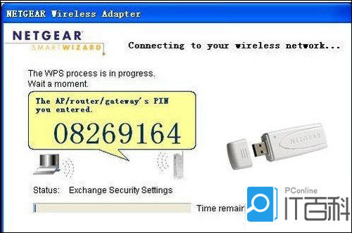 在上一页中介绍到的NETGEAR WN111无线网卡的PIN加密界面键入“08269164”后,点击“Next”进行下一步。会有弹出。