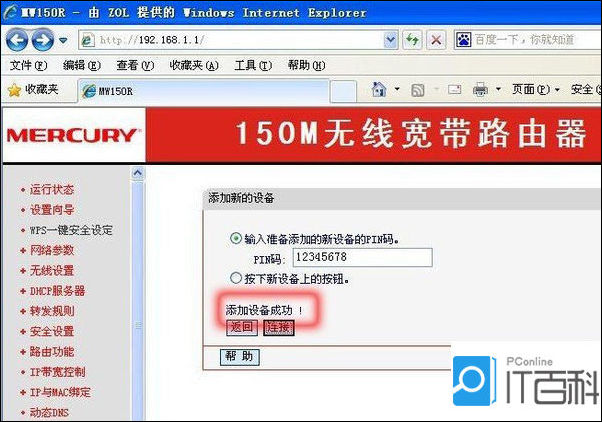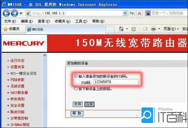 下面以一实际无线路由器设置为大家通俗的讲解下,本文以水星Mercury MW150R无线路由器为例,首先安装好无线路由器,之后在IE浏览器地址栏中键入“192.168.1.1”,弹出用户名和密码对话框,水星的用户名和密码均为admin,键入后就会弹出无线路由器的配置界面。点击“WPS一键安全设定”,即可获取到它的PIN码信息:08269164大家可以先用笔记下来,等下连接上网设备要用到,当然用到了再进路由器查看也可。