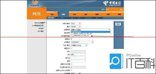 2、进入光猫后找到网络设置选项卡。点击网络设置。然后在新建连接下找到41通道连接,对这个连接进行删除。可以看到这个41通道连接是一个拨号连接因为这个连接下面有账号和密码。