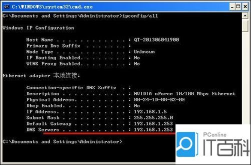 2、点击确定之后,在这个黑色框框里面输入代码: ipconfig/all 然后在记住你的DNS地址!!