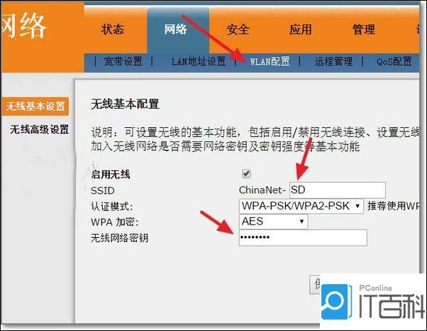 7、然后设置无线WIFI,点击 Wlan配置- 无线基本设置 ,启用无线,设置无线的SSID名称,这里郁闷的是光猫强制了Wifi名称的前缀为ChinaNet,最后设置一个复杂一点的Wifi密码。