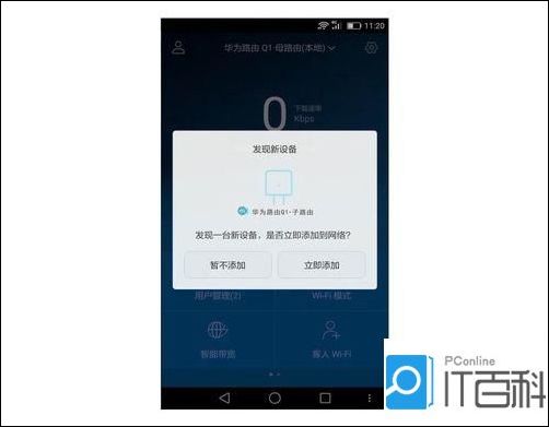 2、打开 Huawei HiLink APP 并成功登陆到到华为路由Q1上,APP将自动检测到新设备,进入首页按照提示添加。
