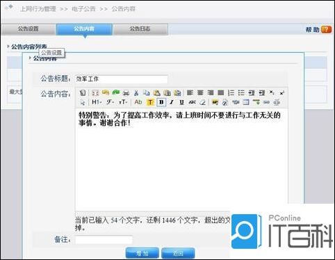 在“公告内容”处增加一段电子公告,增加题目为“效率工作”的公告,