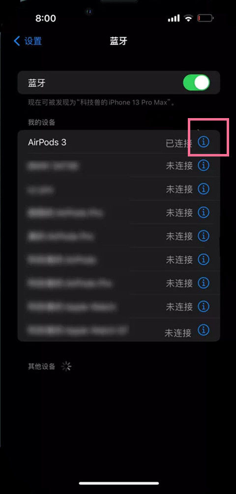 2、选择耳机名称右侧的i图标并进入到耳机设置中。