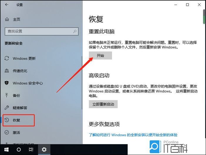 2、更新和安全主页设置窗口中,左侧点击恢复,右侧点击开始重置此电脑,再重新重置一次电脑试试;