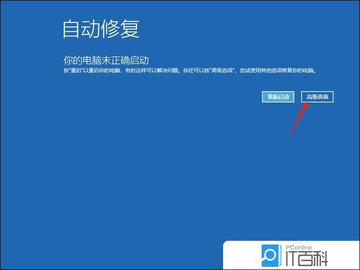 2、自动修复,你的电脑未正确启动,按“重启”以重启你的电脑,有时这样可以解决问题。你还可以按“高级选项”,尝试使用其他选项修复你的电脑,点击高级选项;