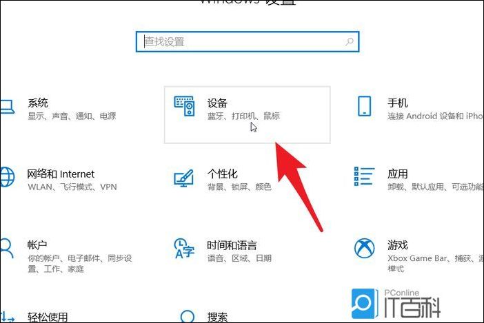 Windows 设置窗口,搜索框可以用来查找设置,也可以找到并点击设备(蓝牙、打印机、鼠标)