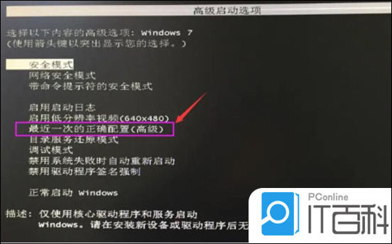 1. 启动电脑后不断按F8键,高级启动选项选择最后一次正确配置,按回车确定;