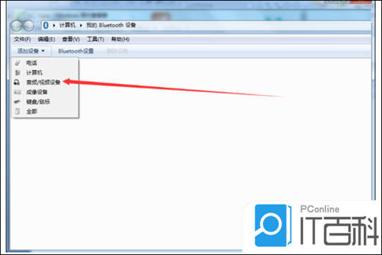 5. 插入蓝牙适配器,打开我的电脑,在我的左上角点击“添加设备”。在弹出的窗口中,点击添加“设备-音频/视频设备”。