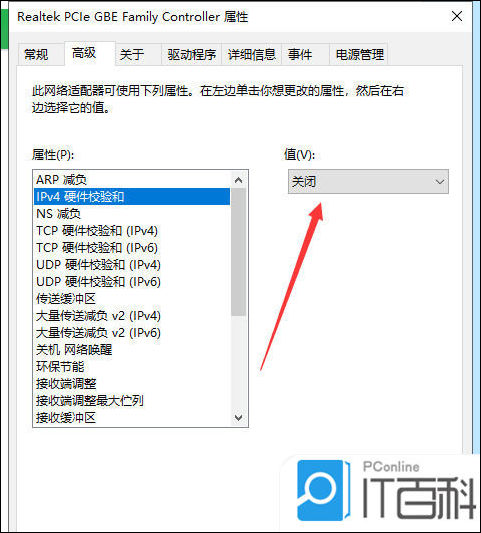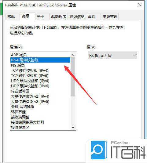 5. 在属性列表中选中“IPV4硬件校验和”;